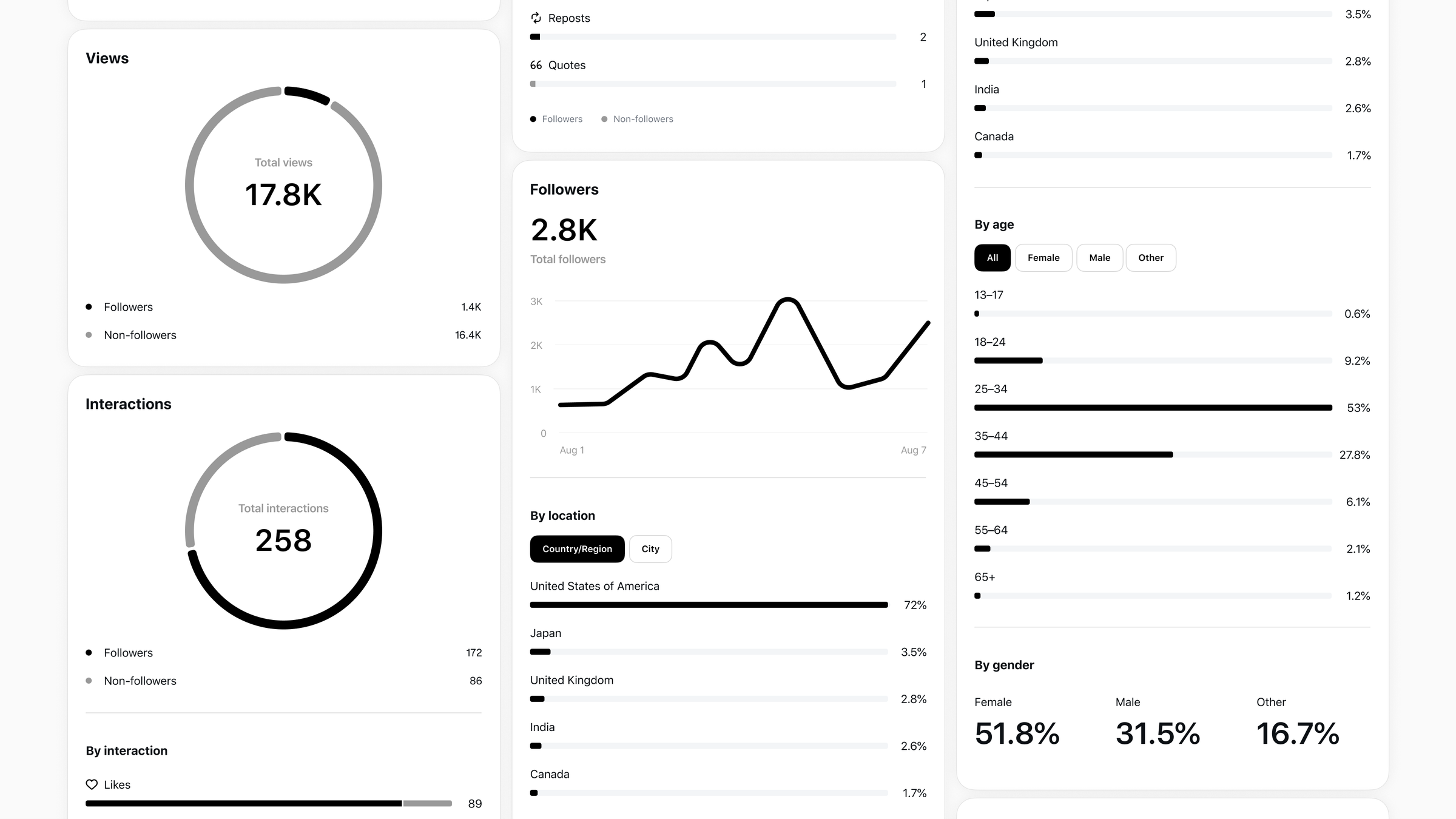 Other features announced today are likely more useful for marketers running brand accounts. A new Insights page, for example, offers data breakdowns for accounts such as follower demographics, interactions, and “views” — a metric Instagram has been pushing as the primary way to understand how content is performing. Some Threads users got early access to Insights this week. Meta also announced that the ability to schedule Threads posts in advance is coming soon. New features will roll out on web first, with mobile versions being “explored” later on.