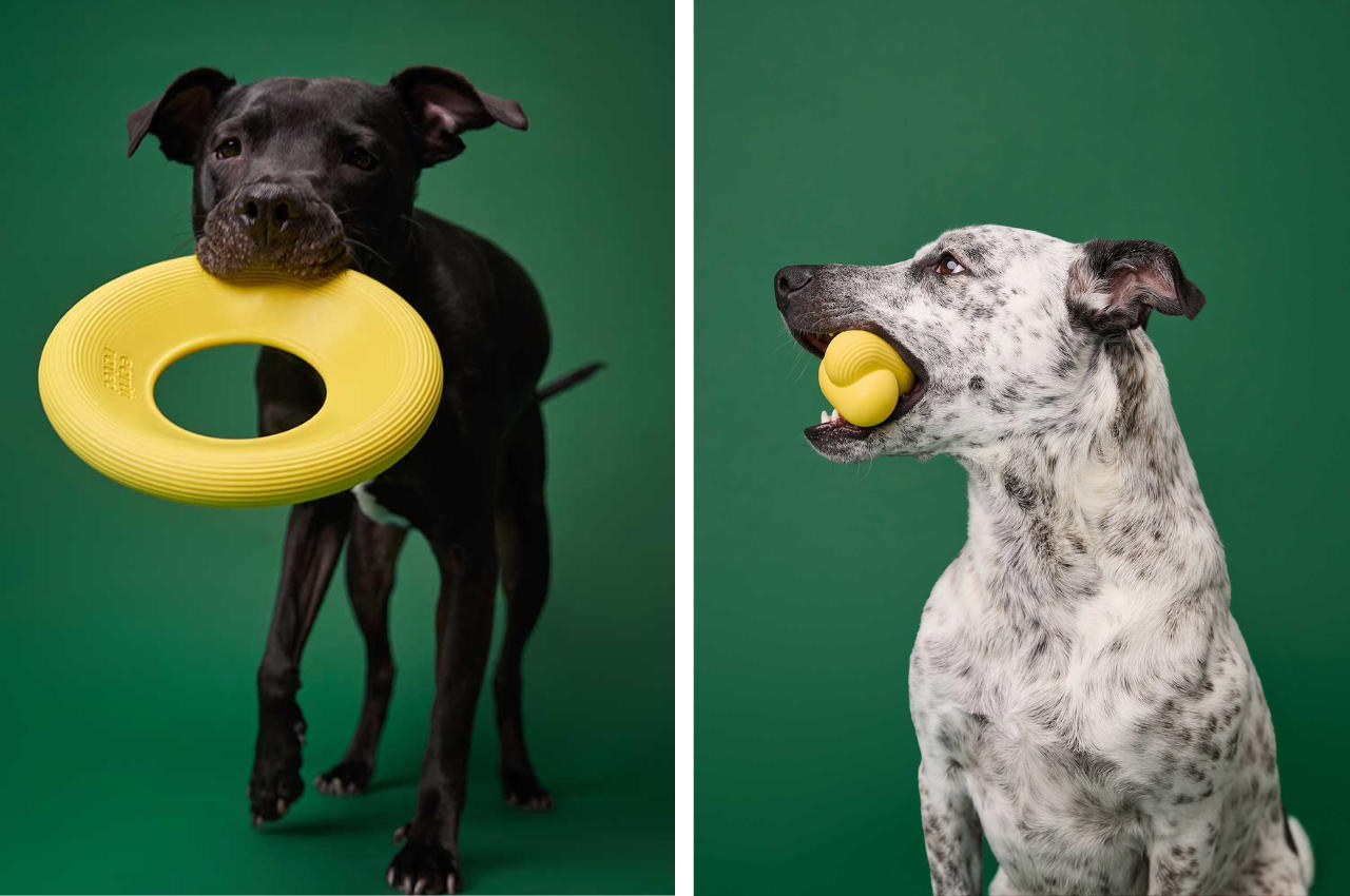 The dog toys feature joyful geometric forms and textured surfaces that invite interaction, building an intuitive user experience for both pets and owners. The toys are made using recycled and recyclable materials, compostable and post-consumer recycled plastics, and natural rubber.