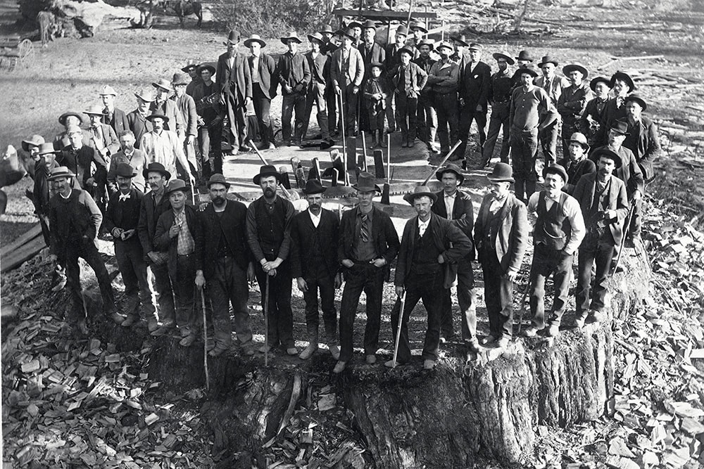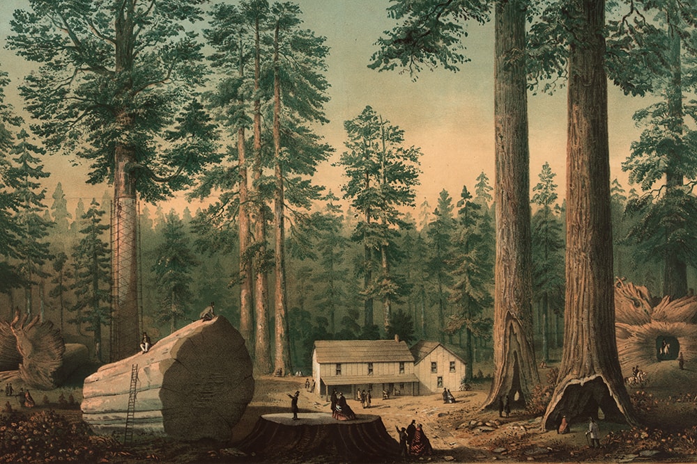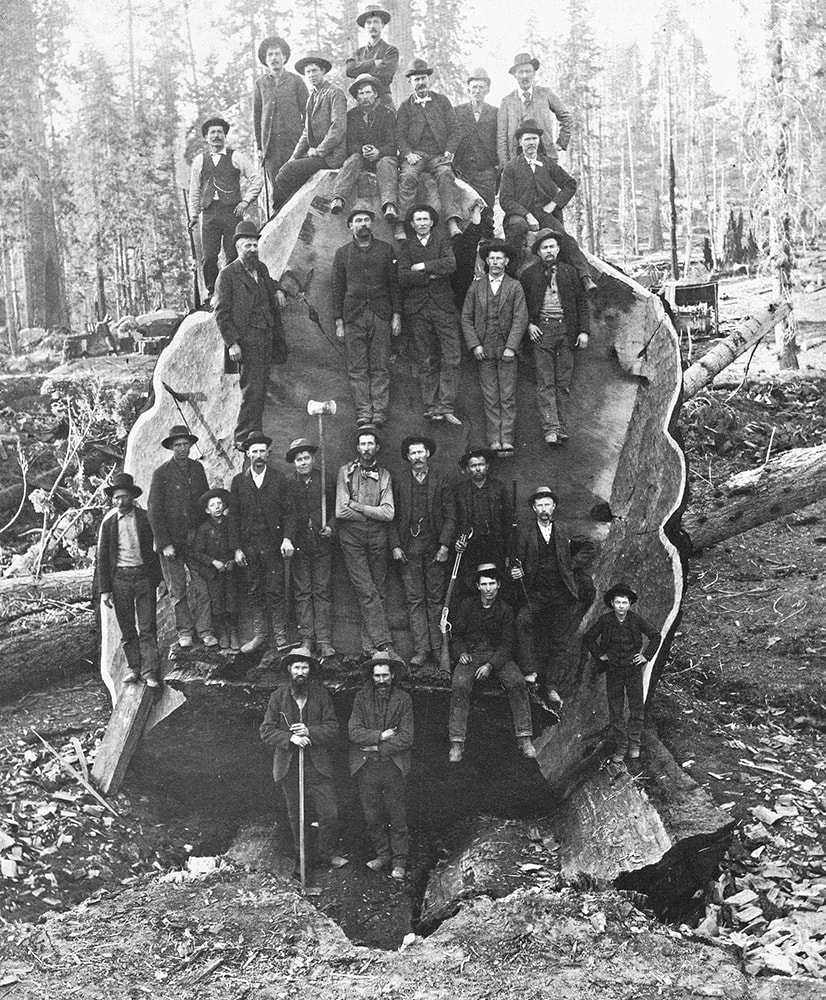 Giant sequoias had only been discovered by white Americans that spring and word quickly spread. Exploitation followed with piano performances and tea dances held on the tree, as well as a bowling alley carved into its prone trunk. The bark from a second felled tree would later be displayed at London’s Crystal Palace to the awe of Victorian England.