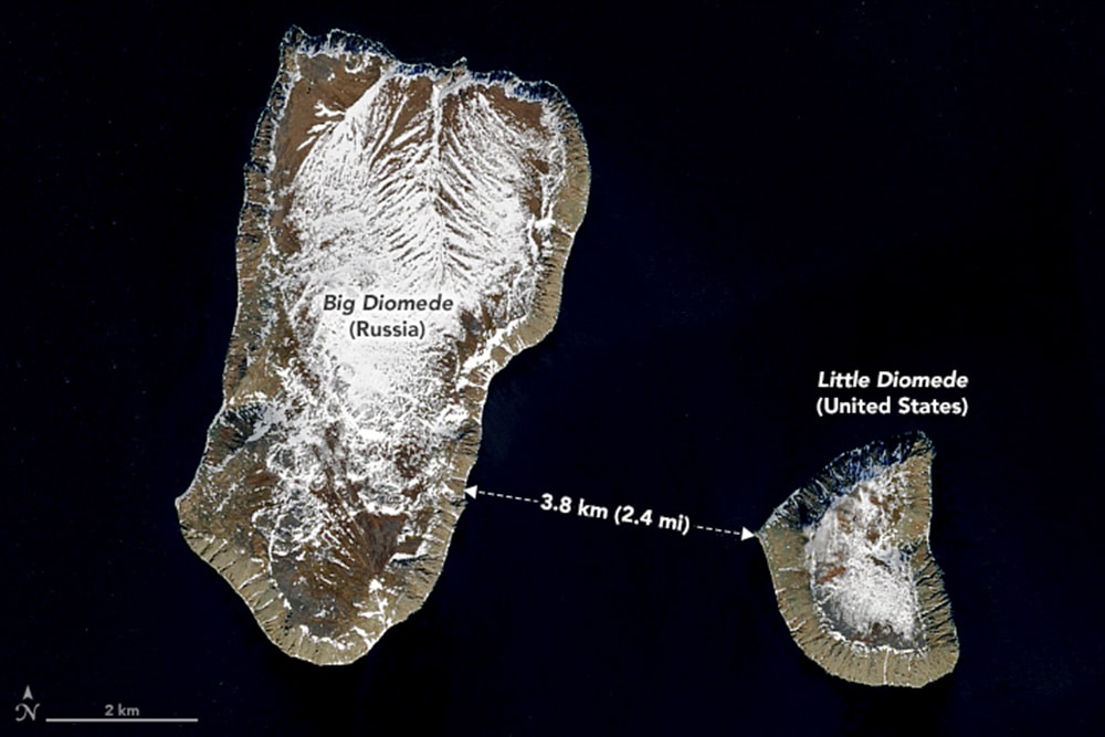 Incidentally, she is right. The Diomede Islands, two rocky islands in the middle of the Bering Strait, lie on either side of the USA-Russia border, just 3.8 km (2.4mi) apart. Big Diomede Island is a part of Russia while Little Diomede is a part of the US state of Alaska.