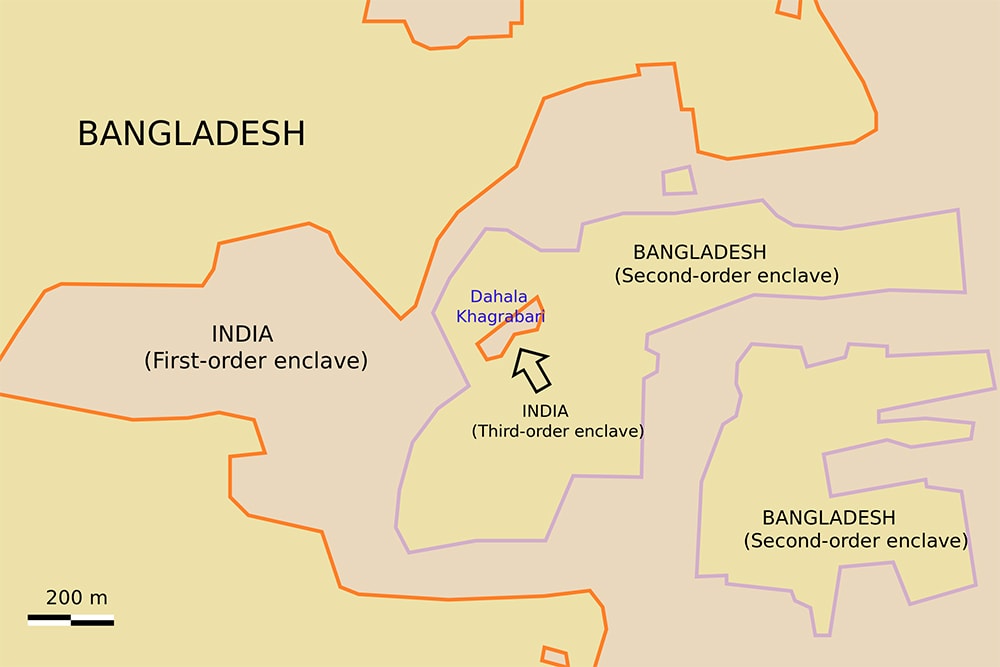 If you saw that image of a shipping ship shipping shipping ships a few years ago, then perhaps you’ll be able to process this more easily. Until 2015, Dahala Khagrabari was an Indian enclave inside a Bangladeshi enclave inside an Indian enclave inside Bangladesh.