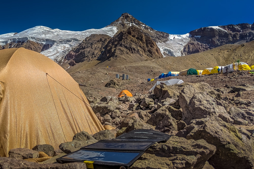 For his Aconcagua climb, he packed a Powermonkey power bank and a Falcon 21 foldable solar charger from PowerTraveller.