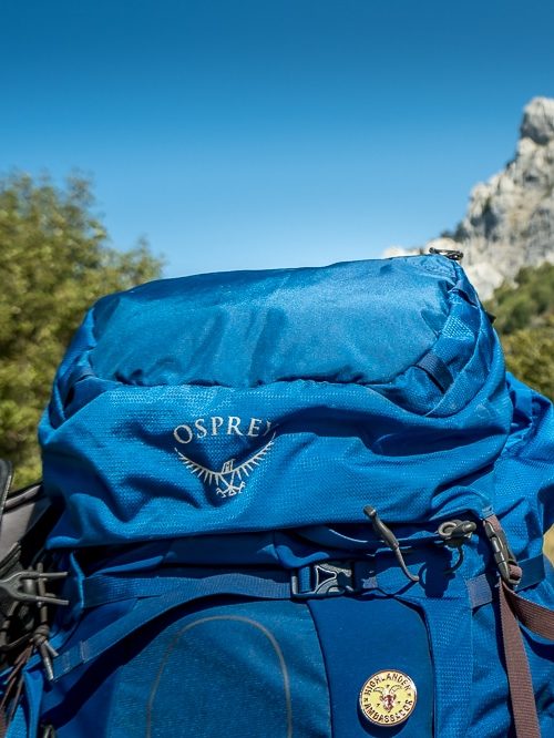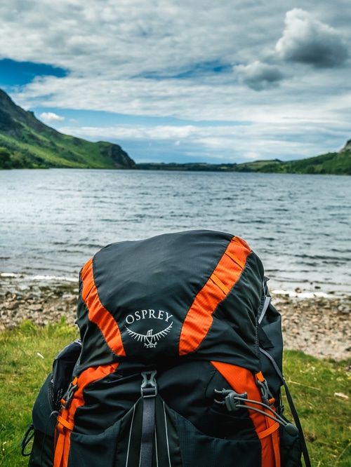 His go-to backpack is an Osprey Exos 38 backpack which weighs in at just a touch over one kilogram. It’s super light, spacious and durable, and suits most camping and trekking trips including shorter wild camping and winter mountaineering trips. Another great option is the Levity 45 which is just 800g even though it holds more.