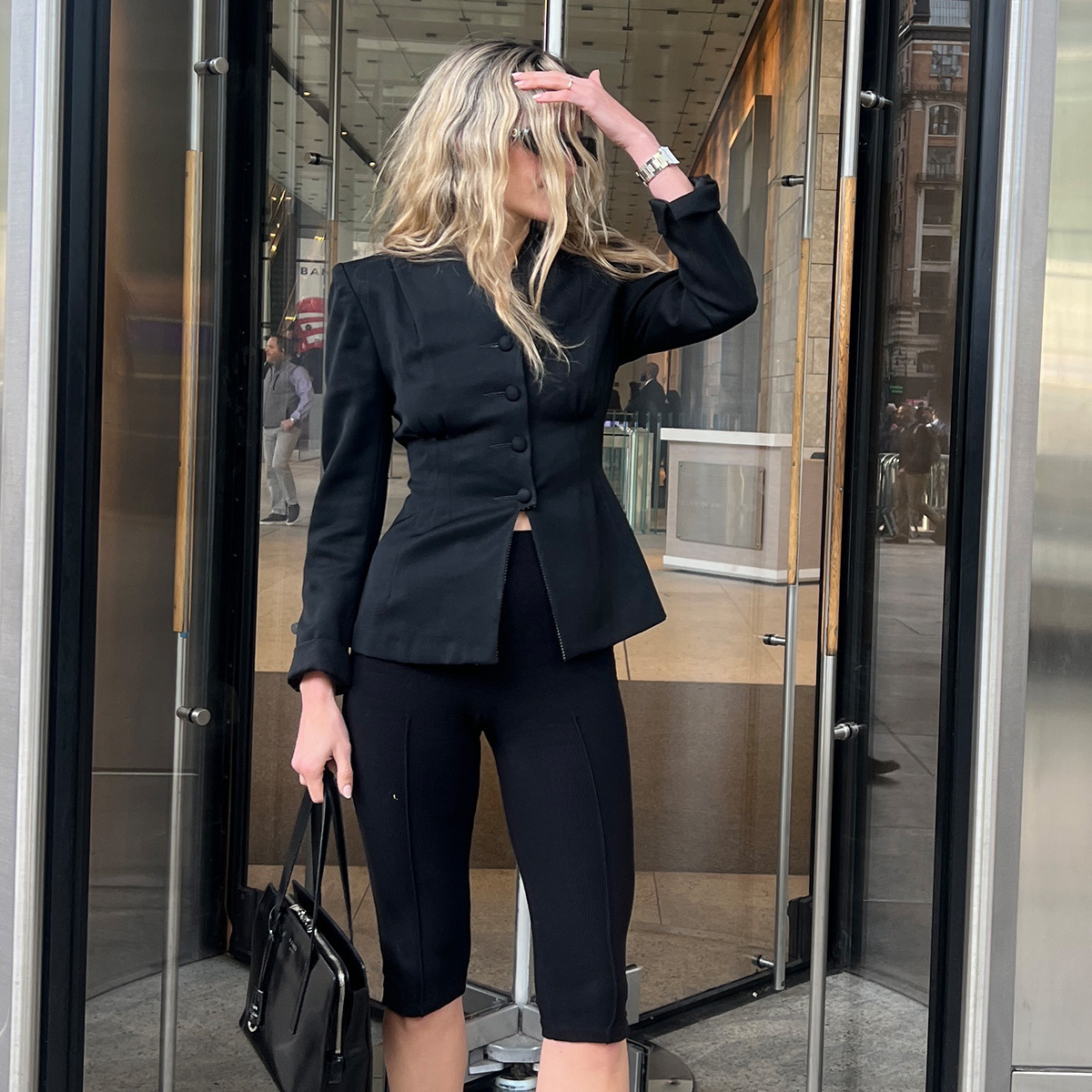 Eliza Huber wearing a fitted black blazer and black Donni capri pants.