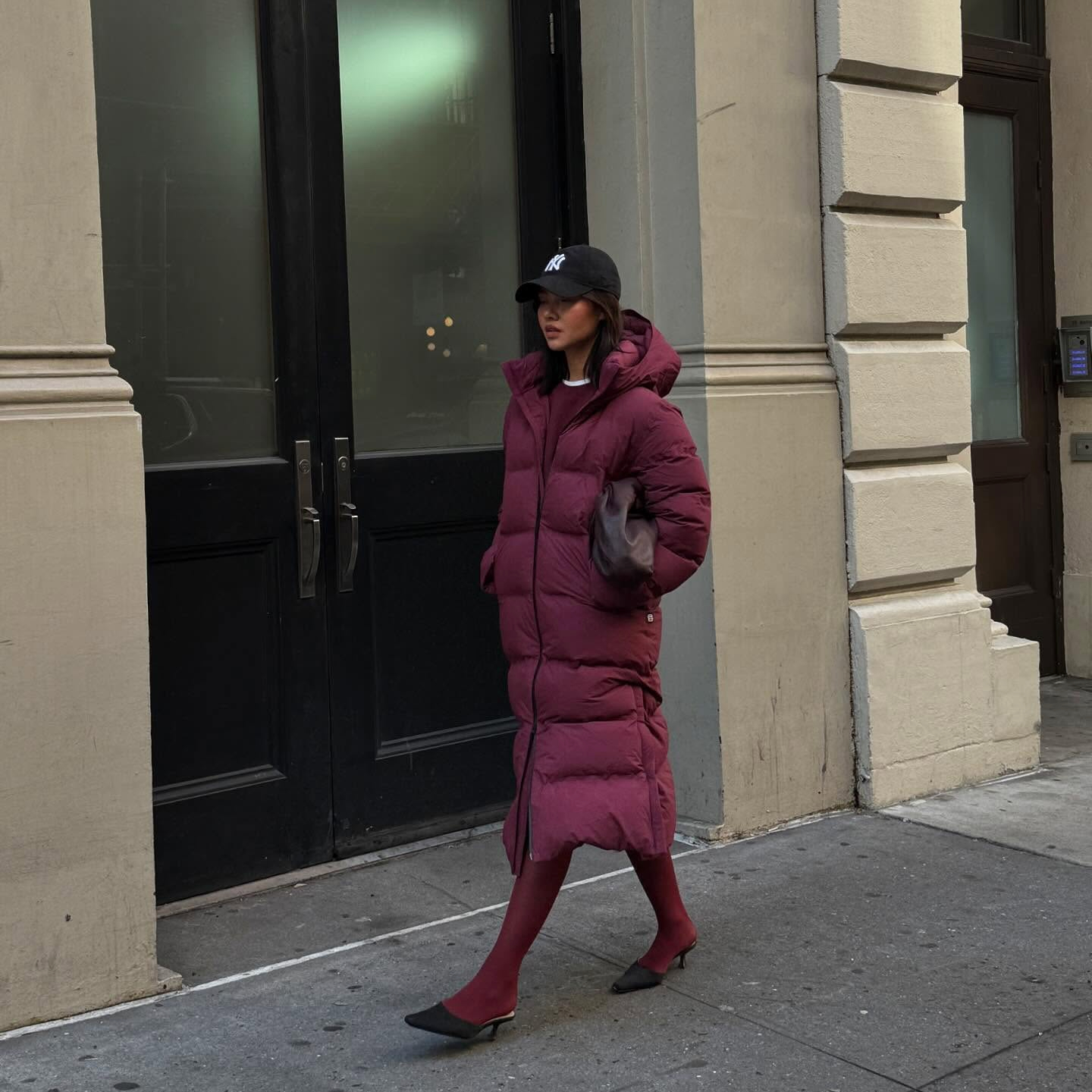 Firstly, I wish all of you the opportunity to wear a head-to-toe burgundy look this winter. Secondly, if anyone is going to change my mind about long puffer coats, it’s Mimi Nguyen in this windproof and waterproof Aritzia style (paired perfectly with her burgundy COS clutch) that’s made with 100% responsibly sourced premium down and promises to keep you warm, even when it’s -40°F.
