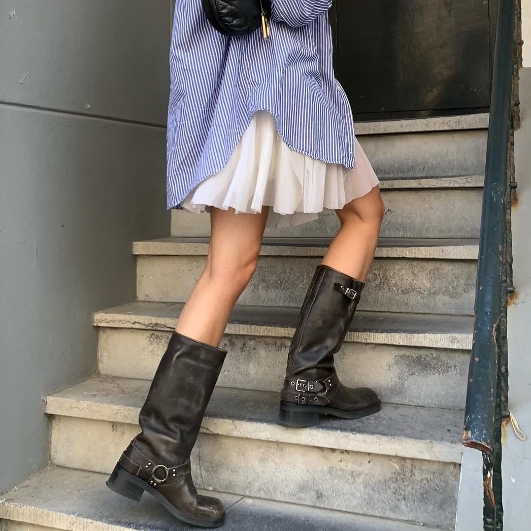 If money were no object, I would opt for the glossy merlot-hued boots that were shown at Gucci, or the olive-hued riding boots that walked at Fendi. But in reality, my budget is more H&M than Hermès, and I’m tempted by the sleek buckled riding boots at Massimo Dutti. There is still a tough, practical element to the boot trends that are resonating in Europe right now. The leading style is certainly rock ‘n’ roll–esque biker boots, with circular buckle details around the ankles or multiple straps across the leg of the boot. Like many shoe trends, this has been spearheaded by Miuccia Prada at Miu Miu and its iconic Sienna biker boot, while it also featured across the A/W 24 runways, including at Burberry, Alexander McQueen, and Coach.