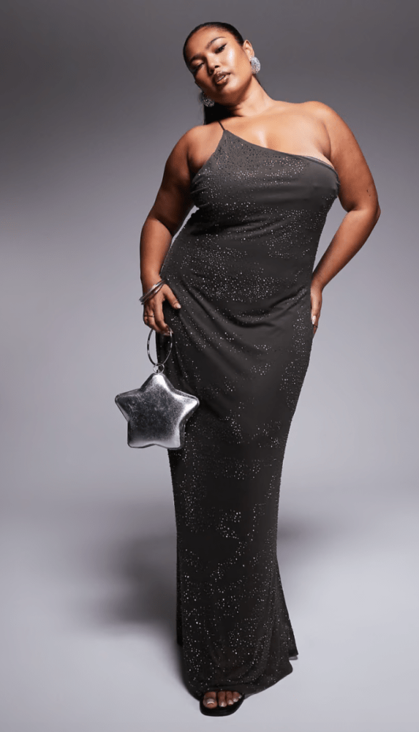 How chic is this single-shoulder maxi dress? Although subtle, the light sparkle resembles stars in the moonlight.