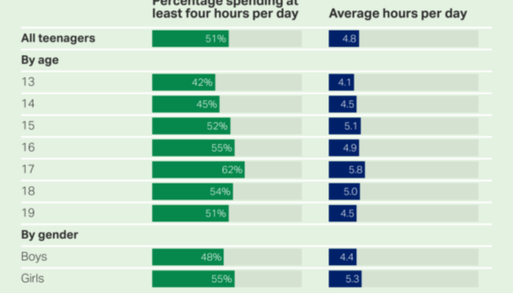 Girls, who have been shown to be particularly vulnerable to the psychological harms of social media, spend even more time on the apps than boys (an average of 5.3 hours a day vs. 4.4 hours for boys) and the platforms consume more of teenagers’ lives as they move through high school: 4.1 hours a day on average for 13-year-olds compared to 5.8 hours for 17-year-olds.