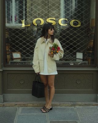 This year, barn jackets have become a wardrobe staple, making them a timeless fashion choice. For a modern look, pair your favorite style with a white T-shirt dress and heeled or flat caged sandals. Finish off the outfit with a bouquet and a designer tote bag.