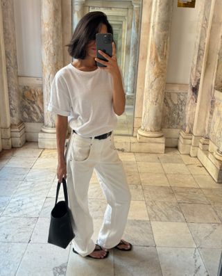 If you have just five minutes to get dressed and want to achieve a luxurious look, opt for a white tee and jeans. To elevate the outfit, accessorize with contrasting black items such as a belt, bag, and sandals. You’ll earn bonus points if you choose elevated flip-flops made from leather, suede, or velvet. This outfit is simple yet consistently stylish, making anyone look like a fashion person.