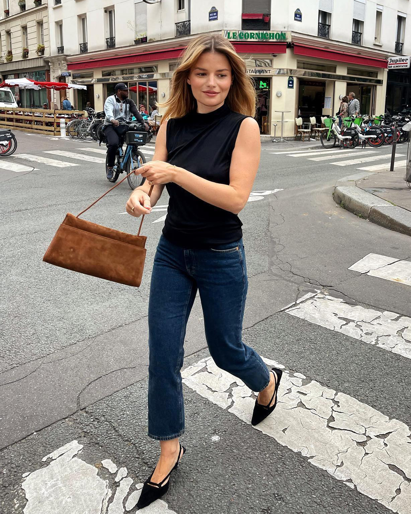This outfit combo includes a high-neck black sleeveless top, dark kick-flare jeans, and black slingback kitten heels. Add a tan suede shoulder bag.