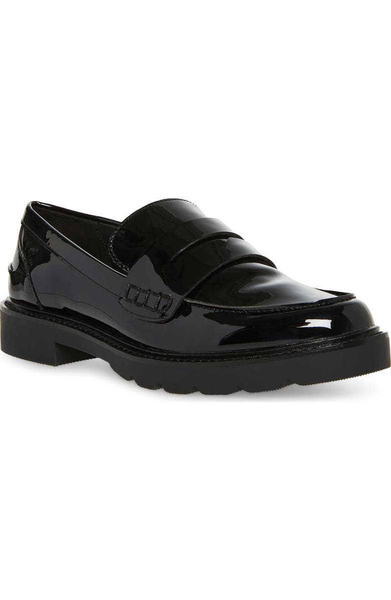 This outfit combo includes a white asymmetrical button-down top, straight-leg jeans, and black patent loafers. Add a black woven tote bag.