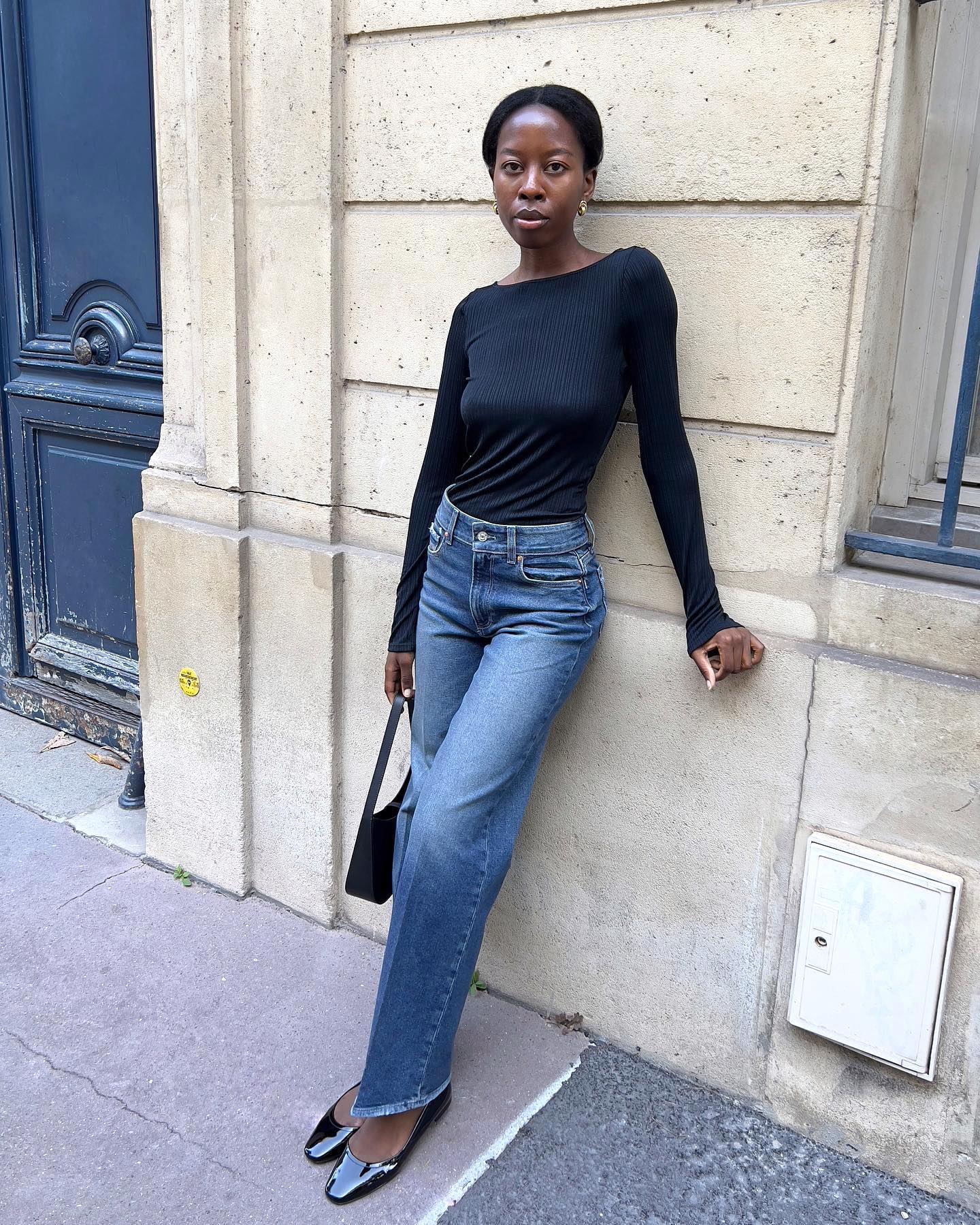 This outfit combo includes a black long-sleeve boatneck top, straight-leg ankle jeans, and black ballet flats. Add a simple black shoulder bag.