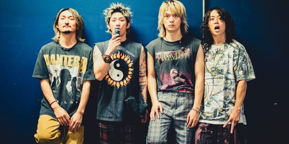 Toru’s look centered on a custom-tailored checkered set by indie Japanese label Matsufuji, styled with a sleeveless band tee and ASICS SKYHAND OG in “White/Black.” For Tomoya, whose high-intensity drumming demands maximum mobility, the go-to uniform consisted of an oversized Atlas-print tee and faded maroon wide-leg shorts with an all-over tattoo-style graphic. He rounded out the look with a handful of silver jewelry, including a “lucky charm” pendant he endearingly named “Mi,” and a pair of well-worn AIRWALK Classics Enigma Low tops.