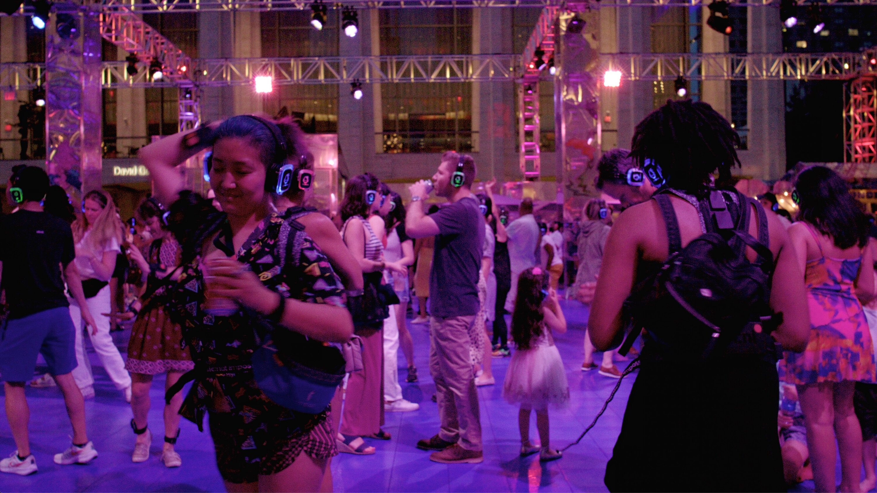 That vision came to life at the Lincoln Center silent disco. As dusk fell, about 75 people, wearing either red, green or blue flashing headphones had a chance to experience the suits. They bopped and swayed to pulsing dance-pop tracks sometimes alone, carving their own circle of rhythm, and sometimes in groups.