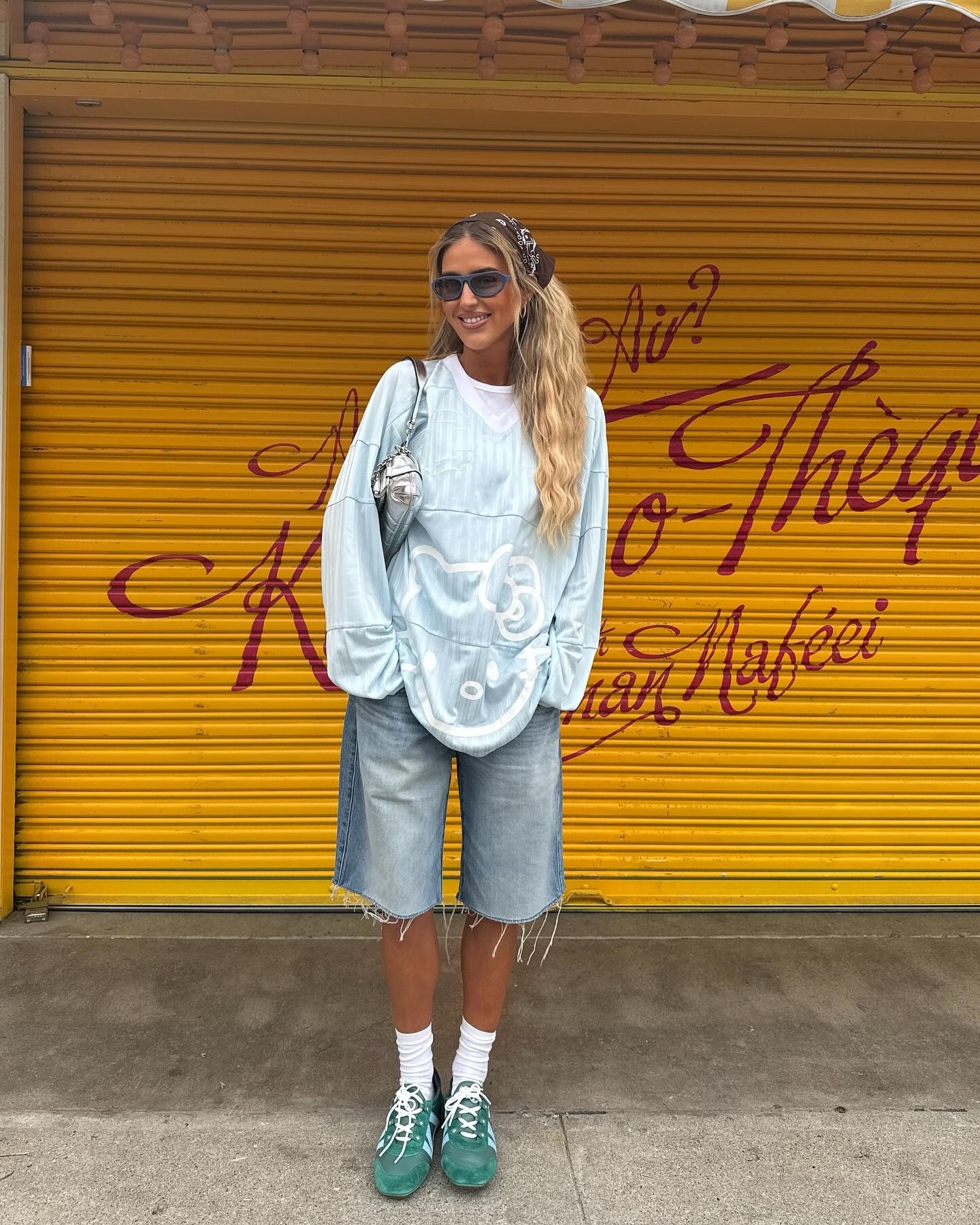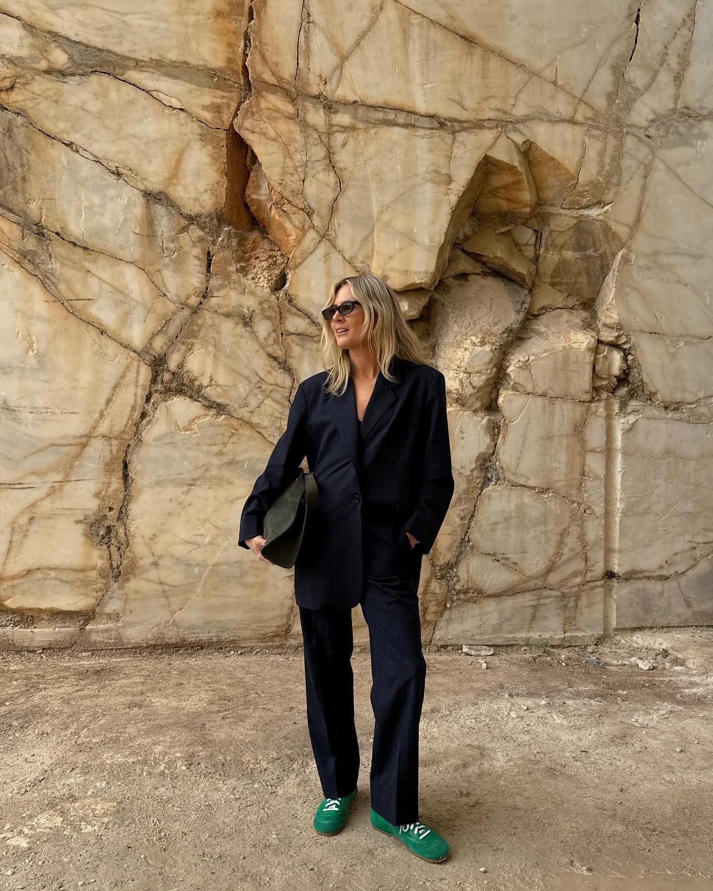 But a white dress isn’t the only wardrobe item that pairs perfectly with green sneakers. In fact, a quick perusal through my Instagram feed and saved folders revealed a plethora of ways to style the loud sneaker shade. You can wear green sneakers with jorts and a baggy jersey à la Emili Sindlev, or with a tailored suit like Lucy Williams. Kendall Jenner wore her Dries Van Noten pair with army pants, while Amaka Hamelijnck chose a Canadian tuxedo.