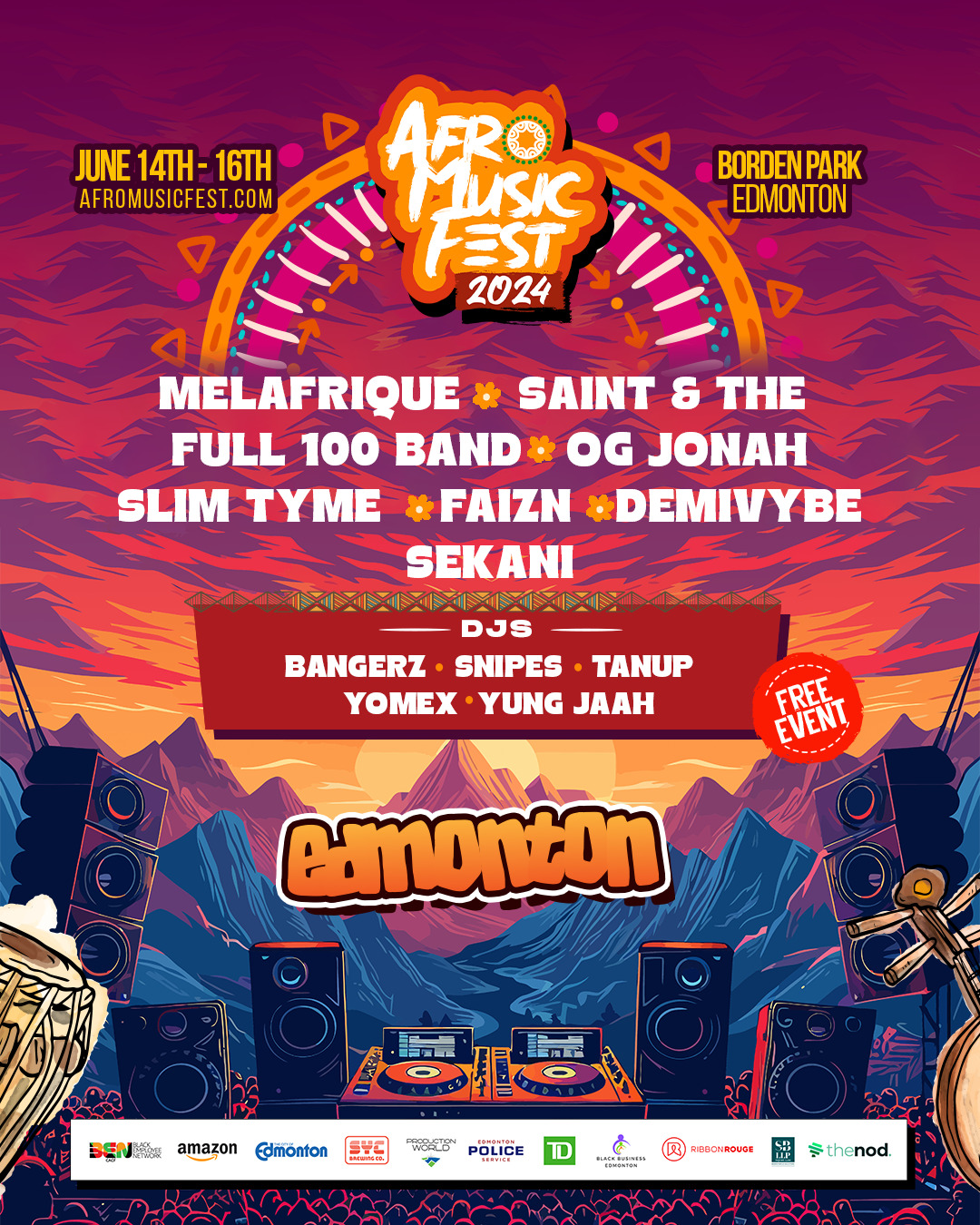 Afro Music Fest is a dynamic and vibrant celebration of African music, culture, and heritage. The festival aims to bring together diverse audiences to enjoy and appreciate the rich sounds, rhythms, and traditions of African music. It fosters cultural exchange, unity, and community engagement through an immersive and entertaining experience. Dates 14-16 June 2024 Venue Borden Park -7507 Borden Park Rd NW, Edmonton, AB T5B 4W8 Highlights: – Live Performances: A stellar lineup of Afro music artists and bands representing various genres, including Afrobeat, Highlife, Soukous, Makossa, and more. Performances will showcase both established stars and emerging talents. – Cultural Activities: Interactive workshops, dance performances, and cultural showcases highlighting African traditions, dances, and customs. These activities offer attendees a deeper understanding and appreciation of African culture. – Food and Craft Market: A diverse array of food vendors offering authentic African cuisine, along with stalls selling traditional crafts, clothing, jewelry, and art. This market provides a sensory experience of Africa’s rich culinary and artisanal heritage. – Community Engagement: Family-friendly activities, educational sessions, and opportunities for attendees to learn about African history, culture, and contributions to global arts and music. Networking Opportunities:Platforms for artists, musicians, and cultural enthusiasts to connect, collaborate, and share ideas. This fosters a sense of community and opens doors for future partnerships and projects. Target Audience: The festival welcomes everyone, from Afro music enthusiasts and culturally diverse communities to local residents and tourists seeking a unique and enriching experience. It appeals to all age groups, providing entertainment and educational value for families, young adults, and seniors. Mission: To celebrate and promote African music and culture in Edmonton, creating a platform for artists to showcase their talents and for the community to engage in meaningful cultural exchange. The festival aims to enhance cultural understanding, appreciation, and unity through the universal language of music. Impact: Afro Music Fest not only entertains but also educates and inspires. It highlights the cultural richness of Africa, promotes diversity, and strengthens the cultural fabric of Edmonton. By bringing people together, the festival fosters a sense of community, belonging, and mutual respect. Join us at Afro Music Fest for an unforgettable journey through the heart and soul of African music and culture!