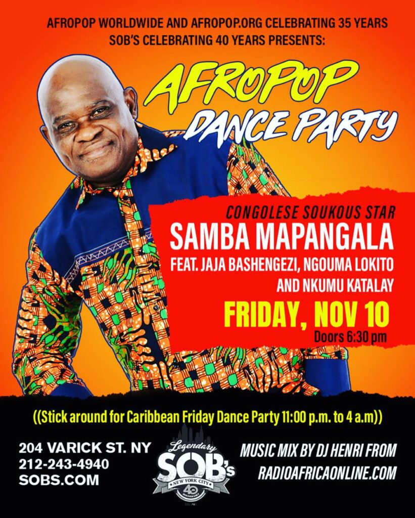 Our friends and colleagues at the Peabody Award-winning public program Afropop Worldwide and afropop.org are celebrating their 35th anniversary with an Afropop Dance Party on Friday, November 10th at the renowned, worldly night club SOB’s in New York City. Featured will be a performance by Congolese soukous legend Samba Mapangala and the Soukous Stars. Also featured is an exhibition of contemporary Congolese art.