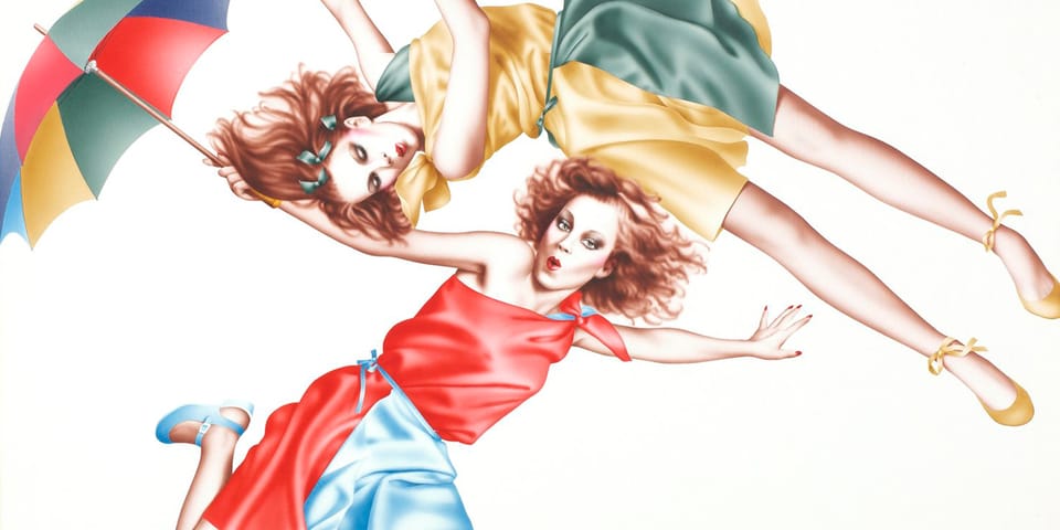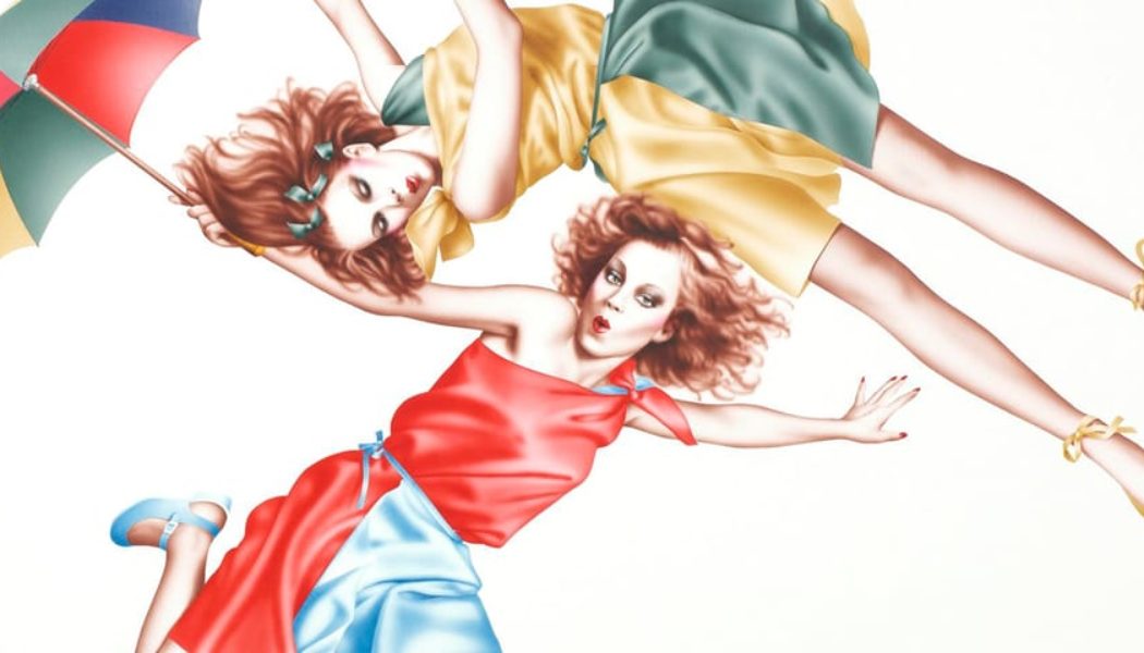 Highlights include a rather uncommon painting by Sorayama, featuring a surfer bailing off his board, which prominently features a marijuana leaf front and center. Additional standouts can be seen in Yamaguchi’s signature airbrushed depiction of two redheaded women floating around one another in dance, as the colors of their dresses and umbrella hint at the vibrancy of the summer months.