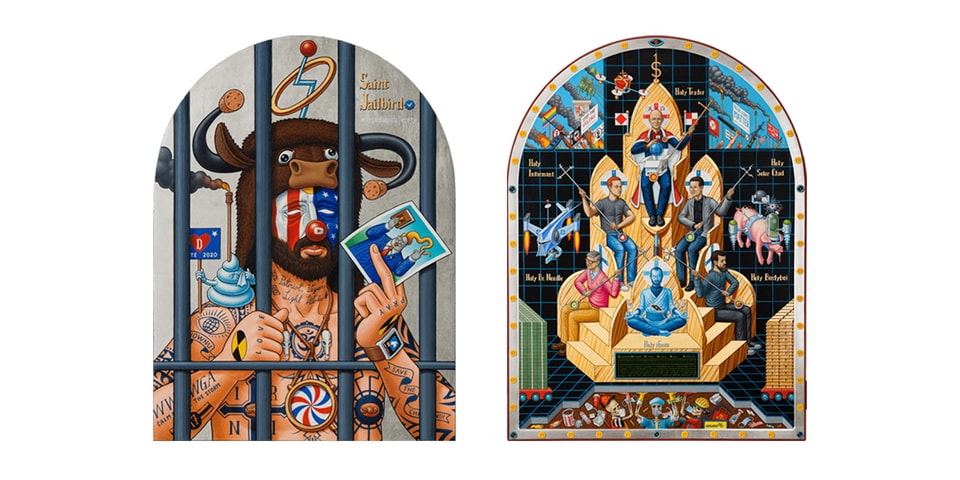 Instead of the religious figures of yesteryear, Todorovic whimsically injects today’s elite — from Mark Zuckerberg and Jeff Bezos, to Elon Musk and Bill Gates. Although the artist uses lowbrow humor to convey his message, the execution of his paintings is nothing short of exceptional. Todorovic experiments across a variety of surfaces, including triptychs and canvas boards shaped to mimic a church window.