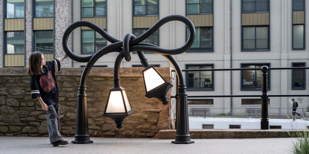 At Assembly Bristol in the UK, the city’s newest waterfront spot, artist Alex Chinneck has introduced a series of sculptural street lamps that blend traditional charm with unexpected twists. Cast in steel, Chinneck’s creations reimagine Victorian-style lampposts with playful forms: two lamps twist into a dramatic bow, while another pair wraps closely together, an embrace the artist calls “First Kiss at Last Light.” A single, upright lamp post completes the scene, contrasting the surreal with a touch of the familiar.
