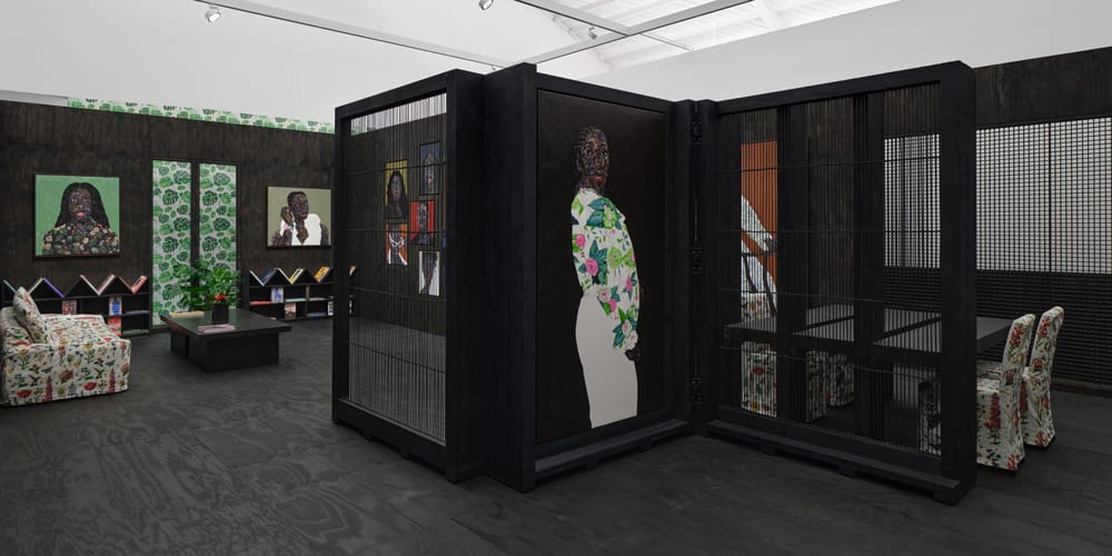 Inside this reimagined sanctuary, Boafo presents a new suite of portraits rendered in his signature fingertip painting technique. Known for his intimate, gaze-forward depictions of Black subjectivity, Boafo integrates these works directly into the studio’s “walls” and within a folding wooden sculpture inspired by the Adinkra symbol nkyinkyim (“twisting”), a tribute to resilience.