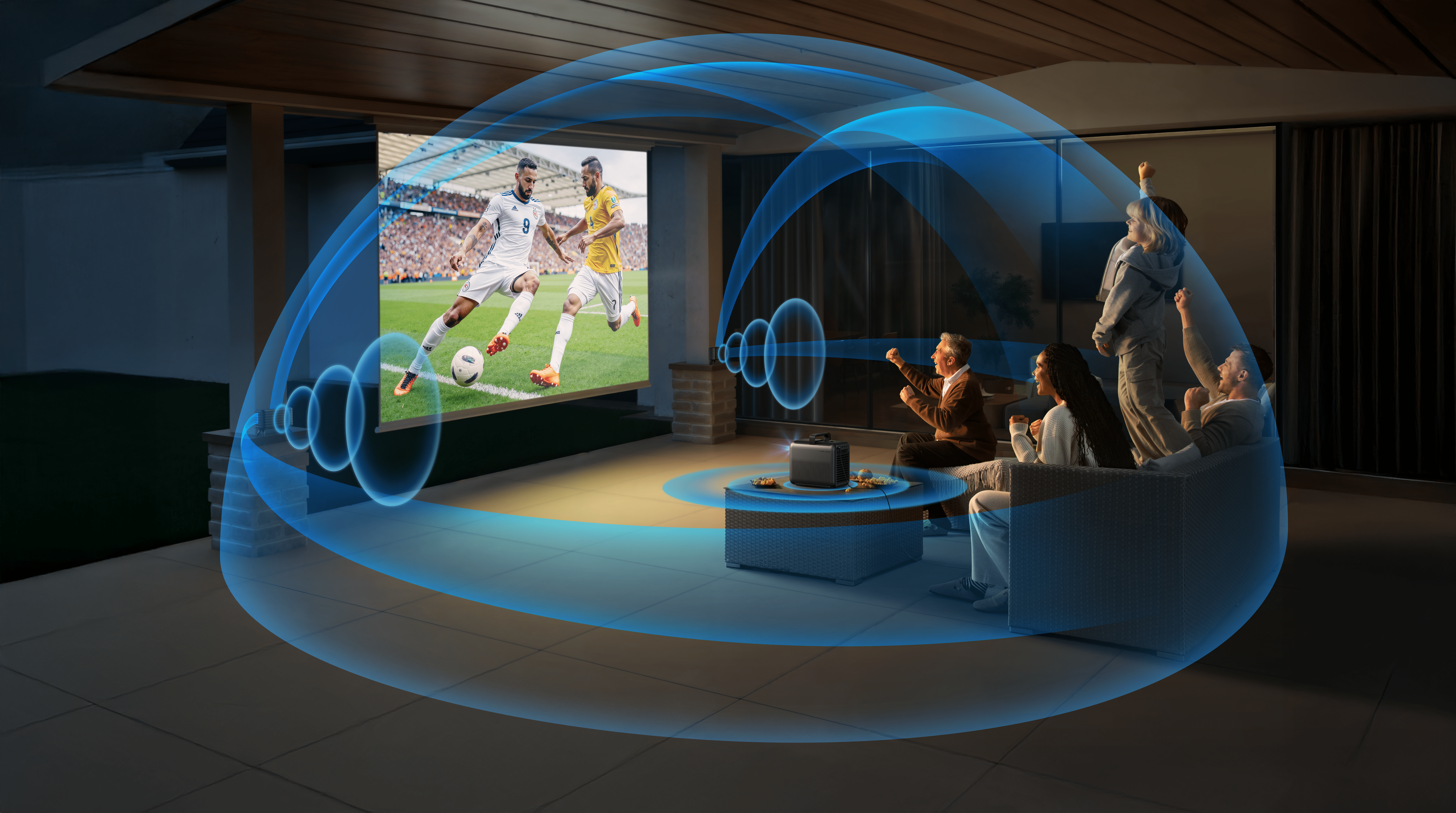 It’s the X1’s sound system, however, that’s the real star of this show. The projector includes four built-in speakers (two 15W and two 5W). Those speakers can be combined with a pair of optional battery-powered Wi-Fi speakers good for up to eight hours of audio. Each satellite speaker contains a 40W pair of front drivers, a 20W upward-firing driver, and a 20W side-firing driver to add width and height to audio. The result is a 4.1.2 surround-sound experience when the audio drivers inside the X1 are switched into subwoofer mode. And while the satellite speakers feature IP54 resistance to dust and rain, the X1 projector itself offers no such assurances.