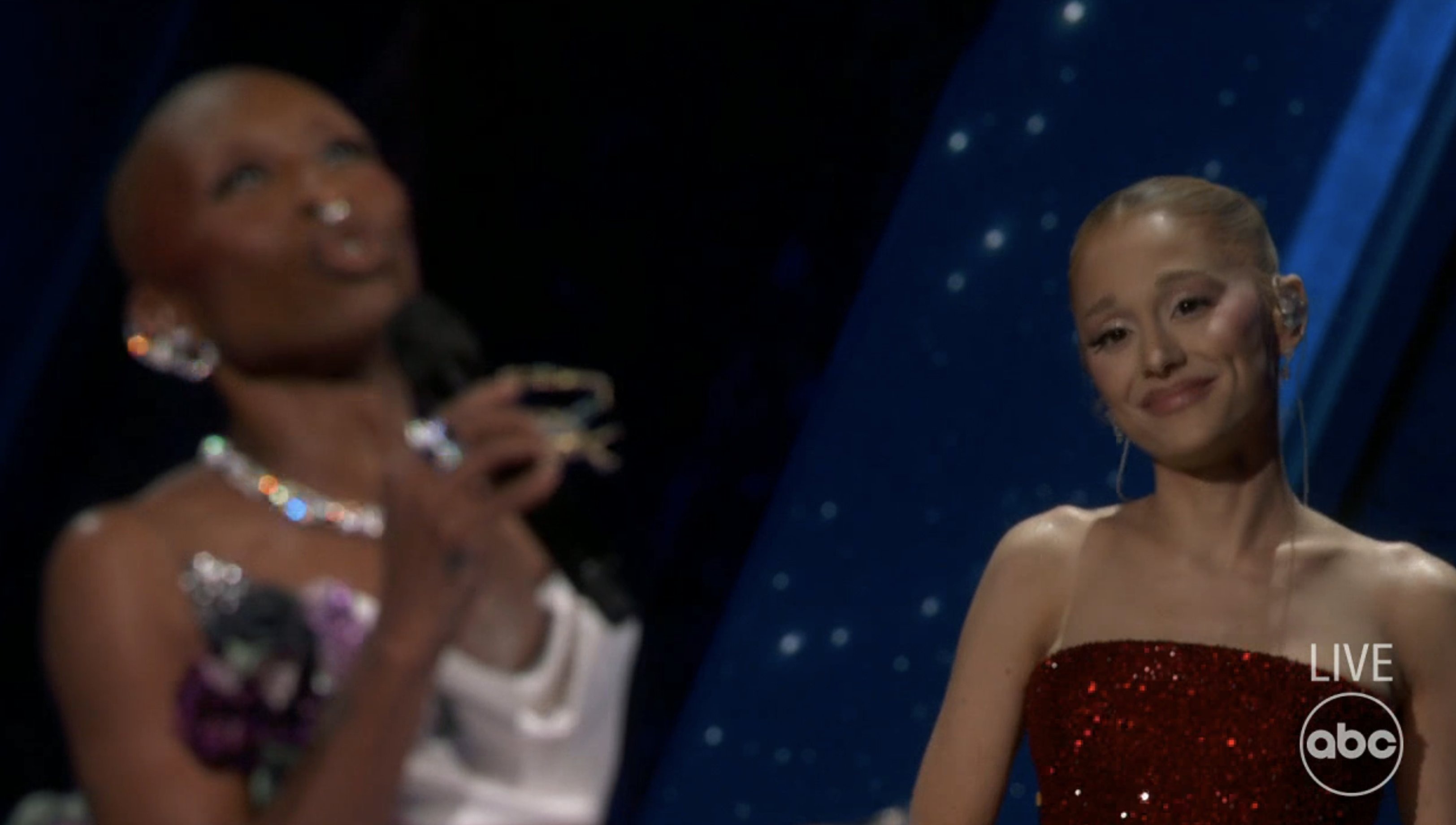 To open the performance, Grande took the stage for a passionate rendition of “Somewhere Over the Rainbow” from The Wizard of Oz. Then, she ceded the stage to Erivo, who dazzled while singing “Home” from the 1978 musical The Wiz. To close it out, Grande returned for “Defying Gravity.”