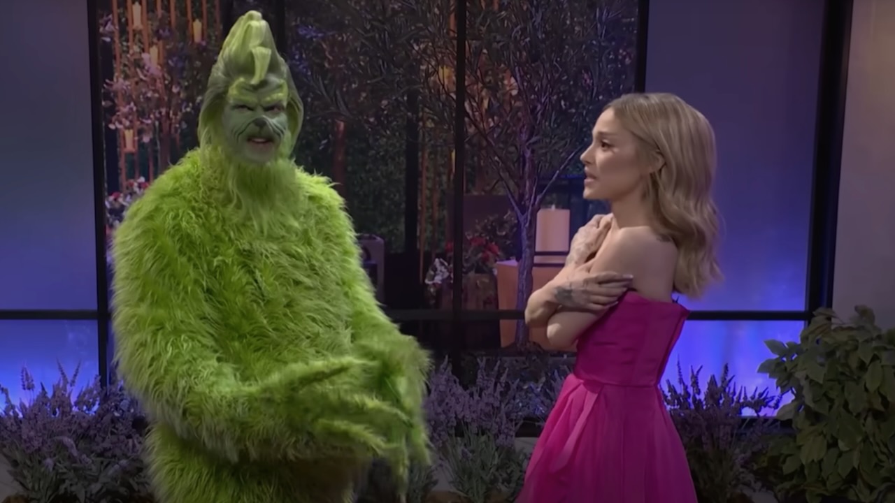 The skit began with Love Is Blind hosts Nick and Vanessa Lachey looking back at Janelle (played by Grande) making an emotional connection with the Grinch (played by Mikey Day). After expressing how excited she is to meet him, the two link up for the first time, and Janelle is visibly shocked that he’s not human. “Are you the literal grinch?” she asks, prompting him to respond incredulously, “Oh, what, you didn’t know? I guess it never came up.”