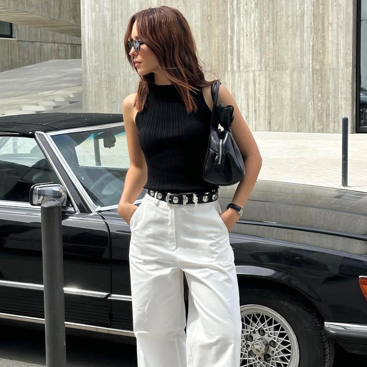 Influencer Debora Rosa poses in front of a vintage black car wearing black tank top, studded Khaite black belt, and white pants