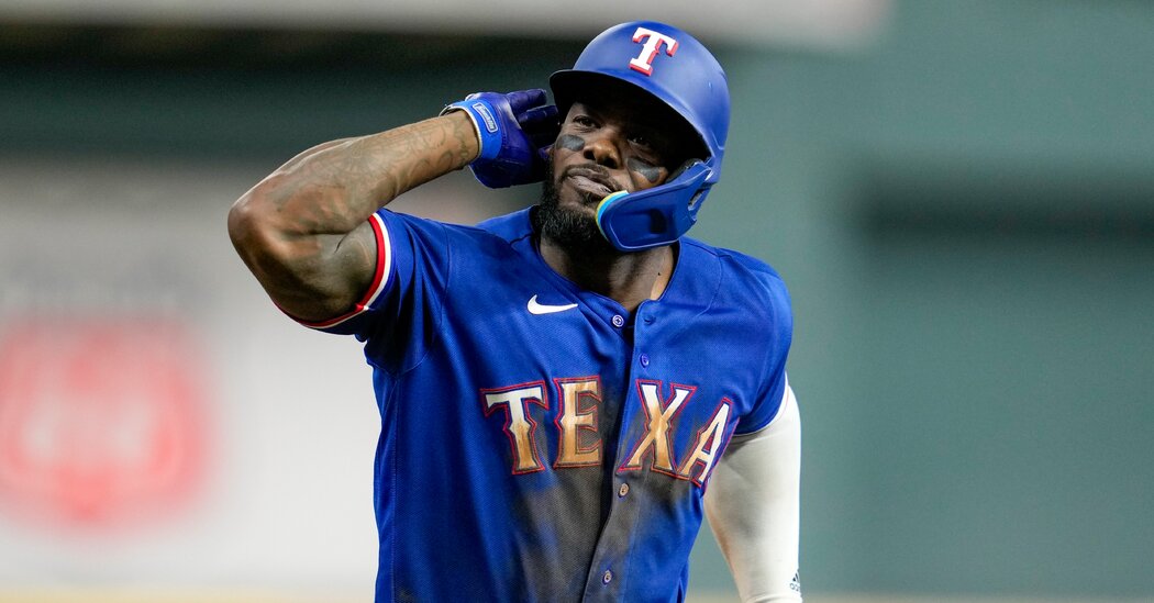 Hours after the Texas Rangers beat the Houston Astros on Monday night to advance to the World Series, Adolis García, the Rangers right fielder, posted 29 shushing-face emojis on X, the social platform once known as Twitter.
