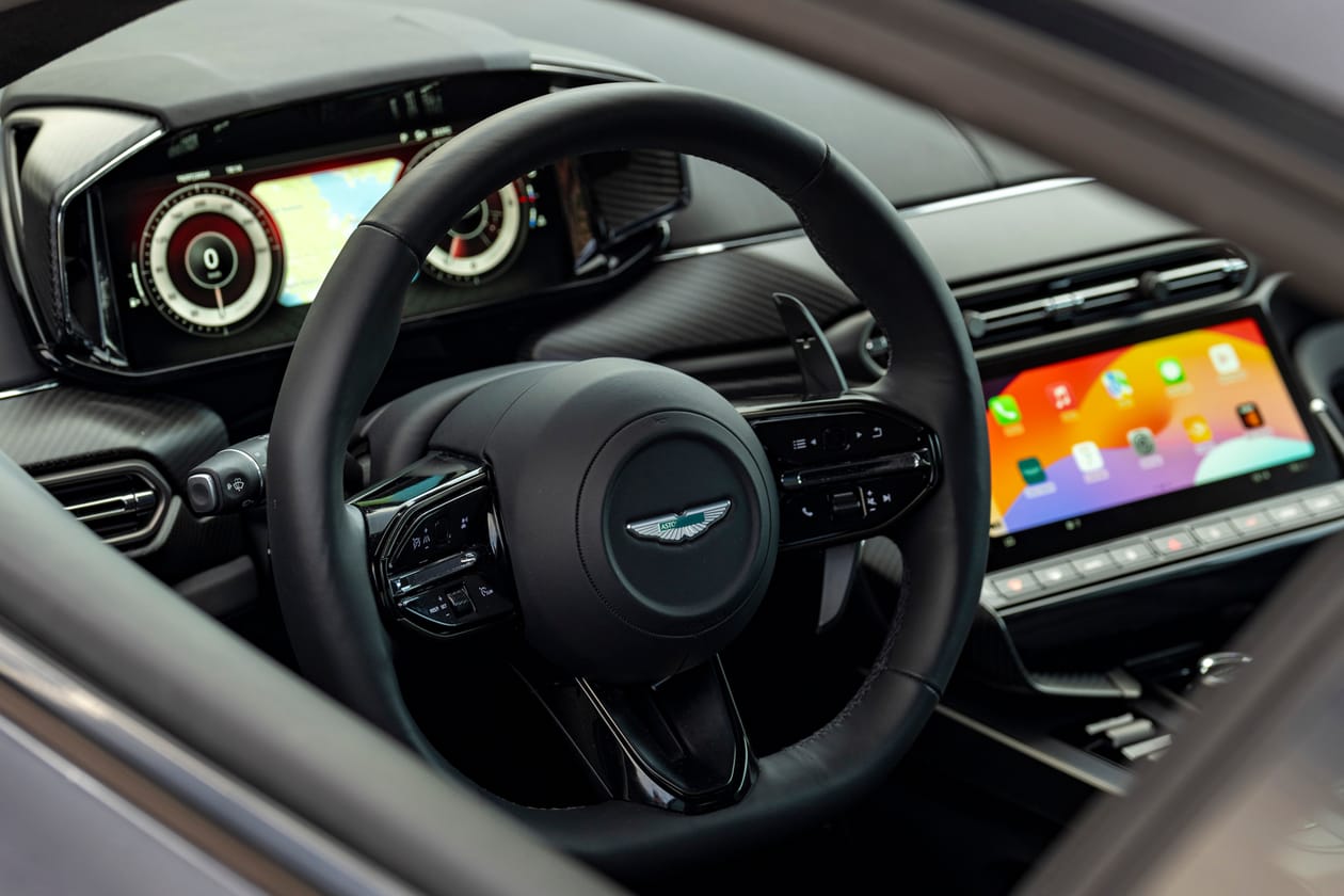 Let’s tackle the biggest and most obvious reason the V12 stands tall – the NVH (industry acronym for “noise, vibration, harshness”). Firing up the Vanquish’s twin-turbo 5.2L V12 engine had a satisfying rumble and vibration. While it didn’t sound like a volcanic explosion per se, it did put a grin on our faces with its deep growl and residual grumble at idle – a reaction we’d never have with an electric car. As we shifted to drive and let off the brake, the car’s take up was so immediate it felt like we had hit the gas by accident, when in fact it was just the cylinders and transmission’s eagerness to up and go. And while we were zooming down straightaways or carving fast corners, even the tiniest of jabs at the accelerator felt like a growing linear force of kinetic energy under our toes – a tall order in our digital “1s and 0s” age.