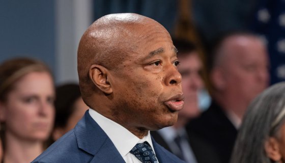 Mayor Eric Adams speaks during the press briefing at the...