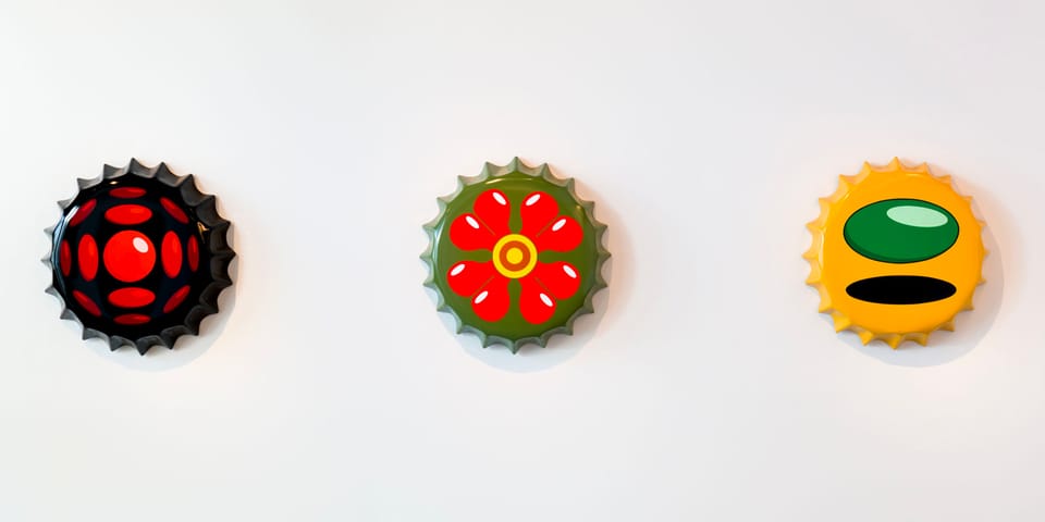 Standout pieces in the show include Sander’s decade-long bottle cap series, in which he creates exaggerated compositions made of vibrant enameled steel works that probe into everyday visual lexicon. Aesthetically, each bottle cap shifts from kaleidoscopic depictions of flowers and astrological signs to sci-fi renditions of biological figures and the endless visuals that often go overlooked.