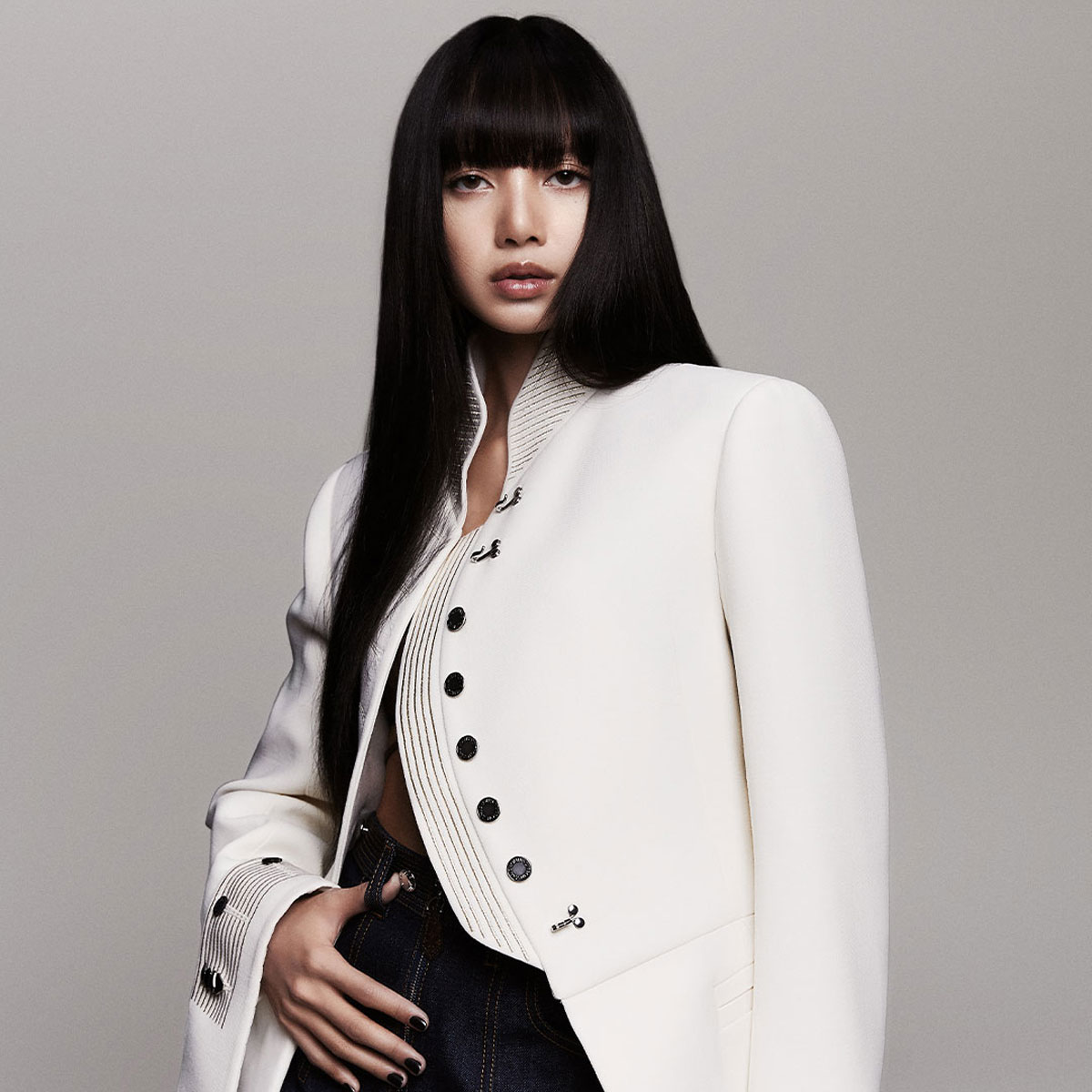Lisa poses wearing a white Louis Vuitton jacket