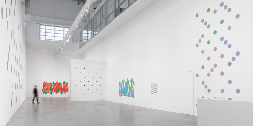 Each wall artwork looks deceptively simple, but reveals itself to the onlooker as the viewer begins to frantically decode the riddles she overlays on the wall. Works such as Dancing to the Music of Time (2022), which Riley created for the National Gallery of Australia, Canberra, guides the eye along a similar path as one would observe a constellation of stars in space.