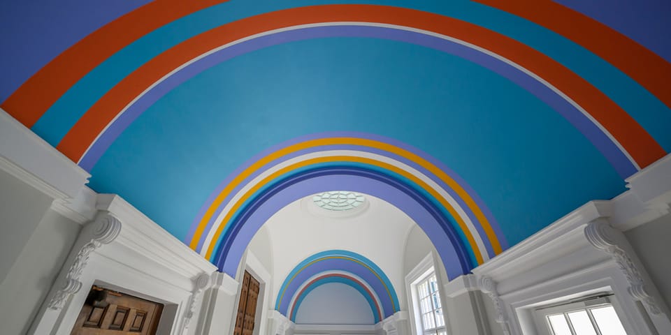 Entitled Verve, the artwork is a somewhat departure from her usual work, which oscillates between the rhythmic and the geometric. But by working with the institution’s architecture, Riley achieves a similar harmony through a series of orderly beams of color, from a dominant sky blue and lilac, to smaller complementary columns of amber, burnt orange, teal and black.