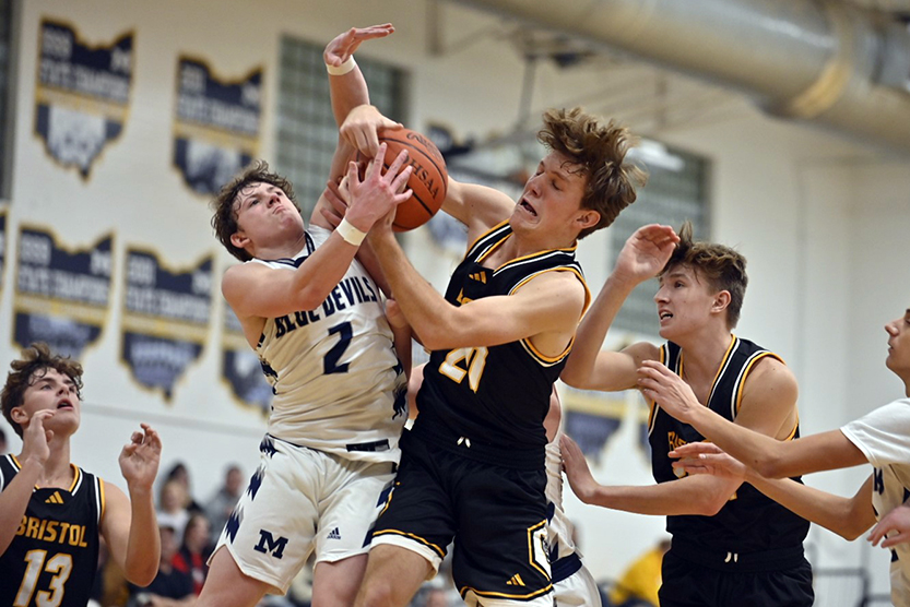 McDonald’s Casey Miller (2) and Bristol’s Zane Shafer battle for a rebound Friday night.