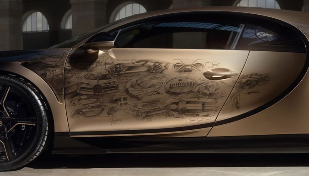 Having taken over two years to craft, the Golden Era first began as a vision from a Bugatti collector with a profound respect for the brand’s history and the technical marvel of the W16 engine. Achim Anscheidt, Bugatti’s former Design Director explained that “A very important customer…wanted to do something truly unique in celebration,” [of the brand and engine]. As the process continued, the vehicle would become an aesthetic journey through Bugatti’s legacy, aptly named ‘Golden Era’, as it portrays 45 hand-drawn sketches of the brand’s icons directly on the exterior and interior of the car.