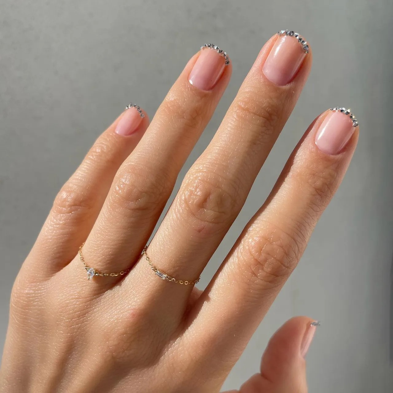 “I’m someone that really likes colors that are next to each other on the color wheel—like blue and green, green and purple, red and yellow, pink and purple,” she continues. “I think those together are really subtle, and they can be really chic as well.” No matter which gems you choose, keep your base polish nude so those sparkles can really make an impact.