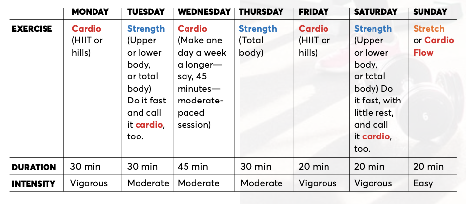 The American College of Sports Medicine (ACSM) recommends accumulating 30 minutes or more of moderate exercise five days a week, or 20 minutes or more of vigorous exercise three days a week. That’s how powerful higher-intensity workouts are. You can accumulate cardio in 10-minute bursts if necessary; the goal is to just move as often as you can.