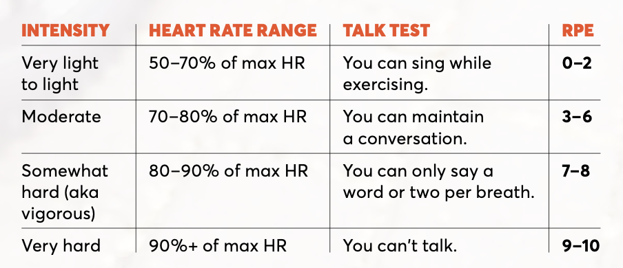 Another way to look at intensity is with the talk test. Your ability to sing, talk, or utter just a few words at a time is a great guide. Finally, the last way to ballpark how hard you’re working is with something called the rate of perceived exertion, or RPE, scale. Zero is lying on the couch and 10 is sprinting for a bus that’s pulling away from the curb. The chart below shows how they compare.