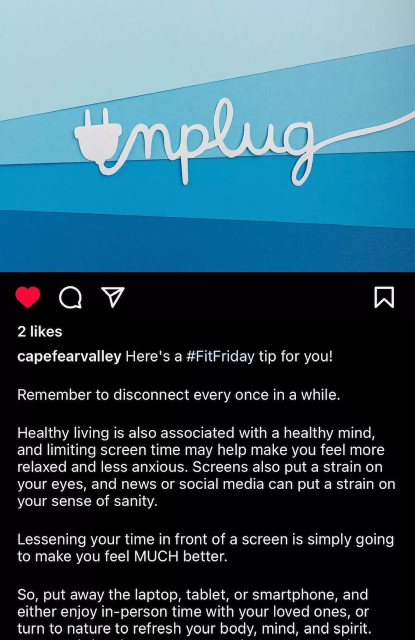 So, remember to disconnect, recharge, and reconnect with what truly matters. Put away those screens, cherish in-person interactions, and embrace the beauty of the world around us. Cape Fear Valley Health’s #FitFriday campaign is here to remind us that a healthier lifestyle begins with small steps towards a more balanced and fulfilling life.