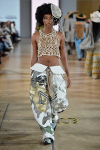 Characterized as Afro futurism viewed through an agricultural lens, her looks were made from pure hemp, organic cotton, and regenerative cotton that Owusu-Agyemang grew in her native Zambia. Every fiber was entirely traceable, the designer said in an interview, noting that her green thumb began during COVID, when she experimented with growing plants on her balcony.