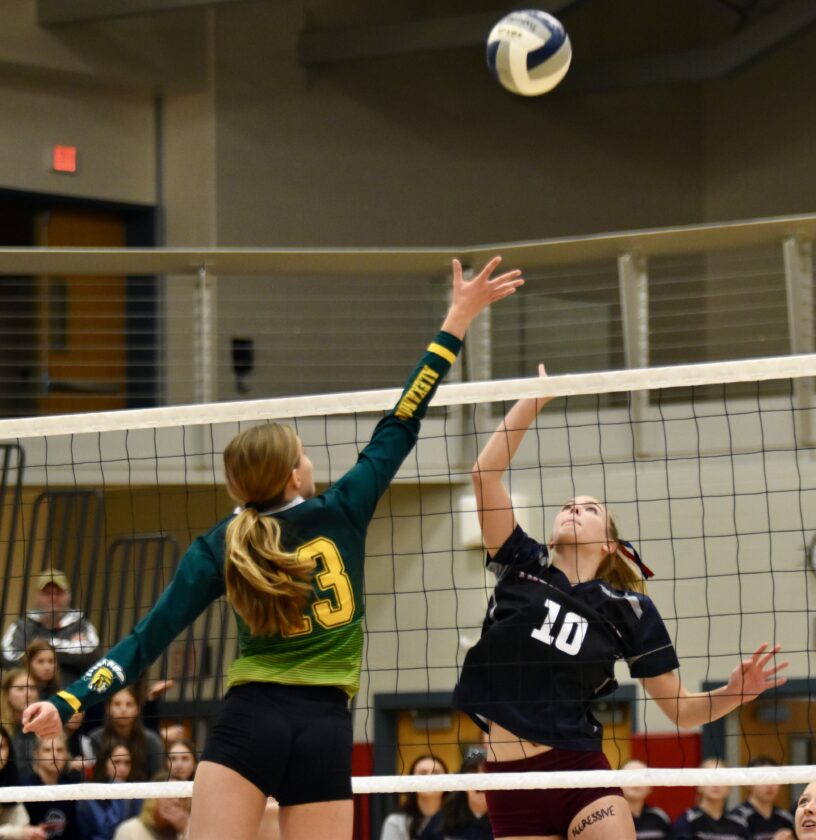 Chautauqua Lake’s Bre Smith spikes a ball in front of Alexander’s Maia Saile in the FWR. P-J photo by Christian Storms