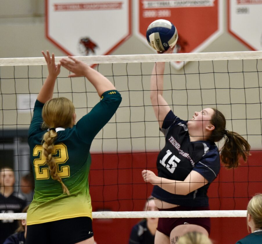 Chautauqua Lake’s Noli Paddock bumps a ball over Alexander’s Carley Shepard in the FWR on Friday.