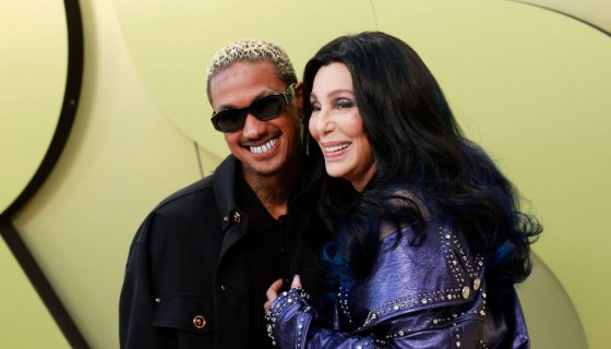 US singer/actress Cher and rapper Alexander Edwards arrive for the Versace Fall/Winter 2023 fashion show on March 9, 2023, at the Pacific Design Center in West Hollywood, California. (Photo by Michael Tran / AFP) (Photo by MICHAEL TRAN/AFP via Getty Images)