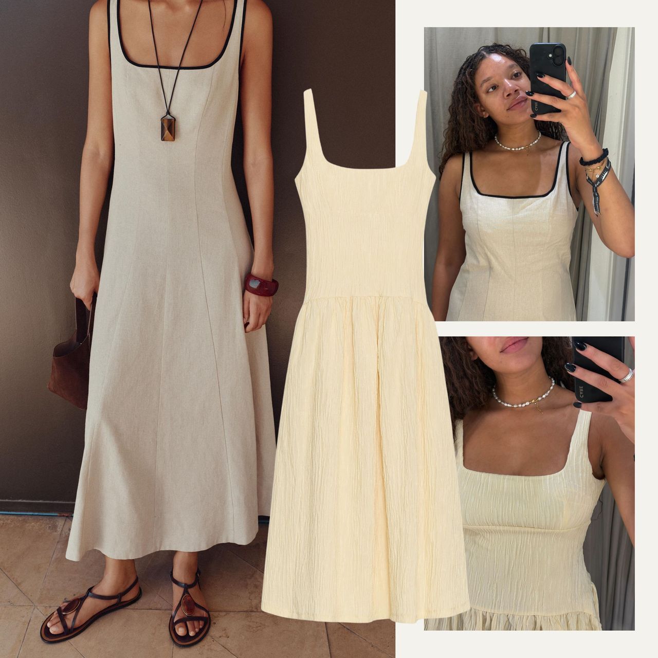 I’d been browsing for a while when I caught sight of a beige linen dress complete with contrast-piping slung over the arm of another customer. Cue the panic. I scanned the rails and, to my relief, found a small rack with just three dresses, one of which was in my size (a medium). Naturally, I grabbed it. Then, I spotted the second: a soft butter-yellow, textured style with a dropped waist that had a group of shoppers swooning nearby. I didn’t hesitate—it was coming with me to the changing room, too.