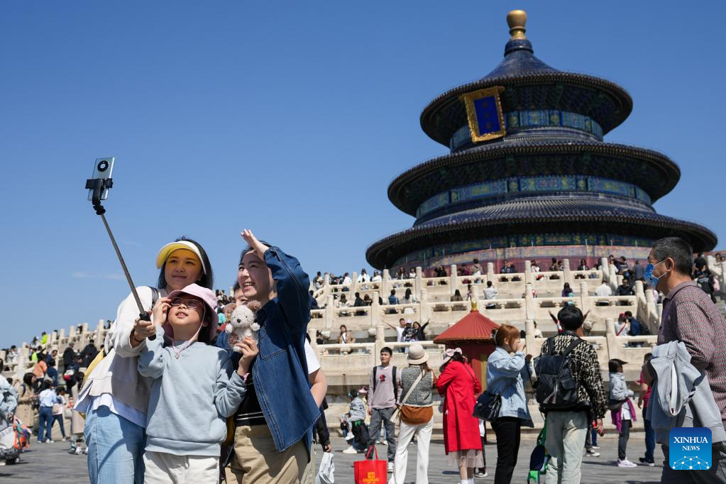 People take selfies at the Temple of Heaven in Beijing, capital of China, April 29, 2023. /Xinhua