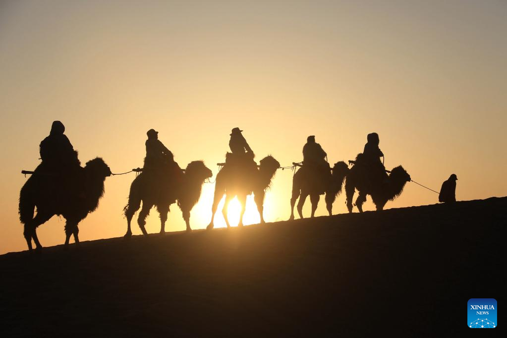 People visit the Mingsha Mountain and Crescent Spring scenic spot in Dunhuang, northwest China’s Gansu Province, April 29, 2023. /Xinhua